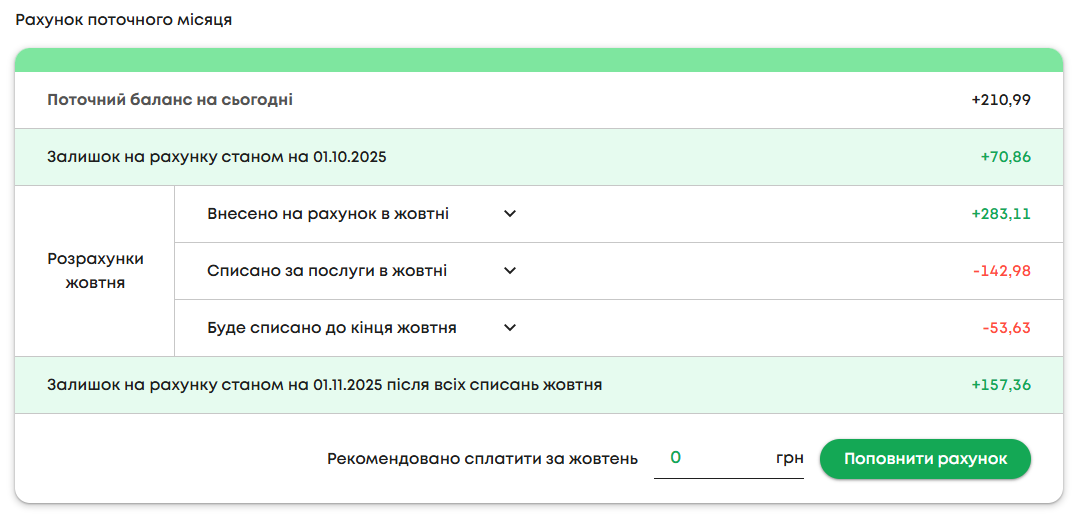 У розділі «Рахунок» ви зможете побачити свої витрати з початку місяця.