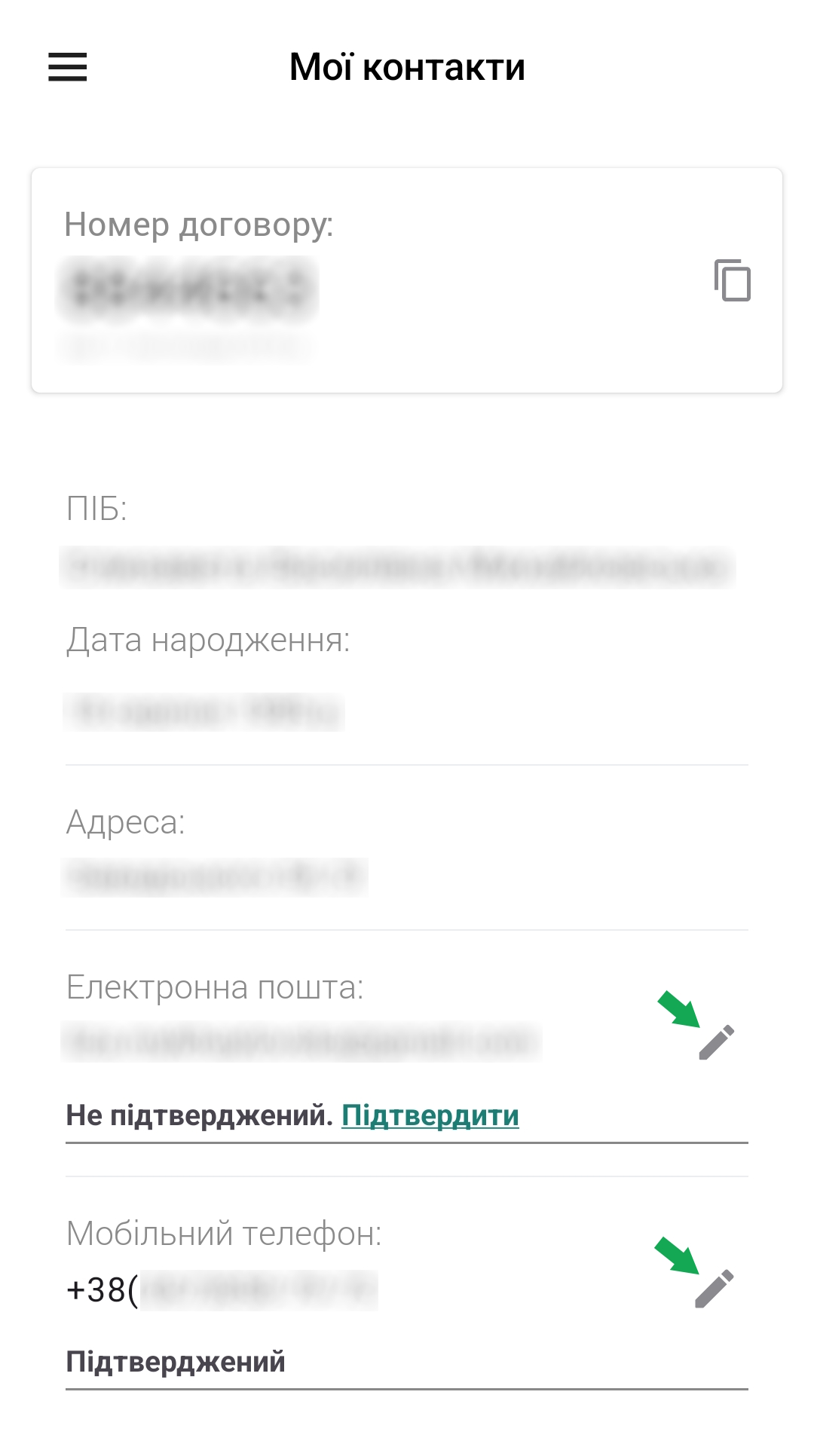 Щоб змінити контактні дані, відкрийте розділ «Мої контакти» у меню та натисніть на іконку олівця для редагування біля потрібного поля.