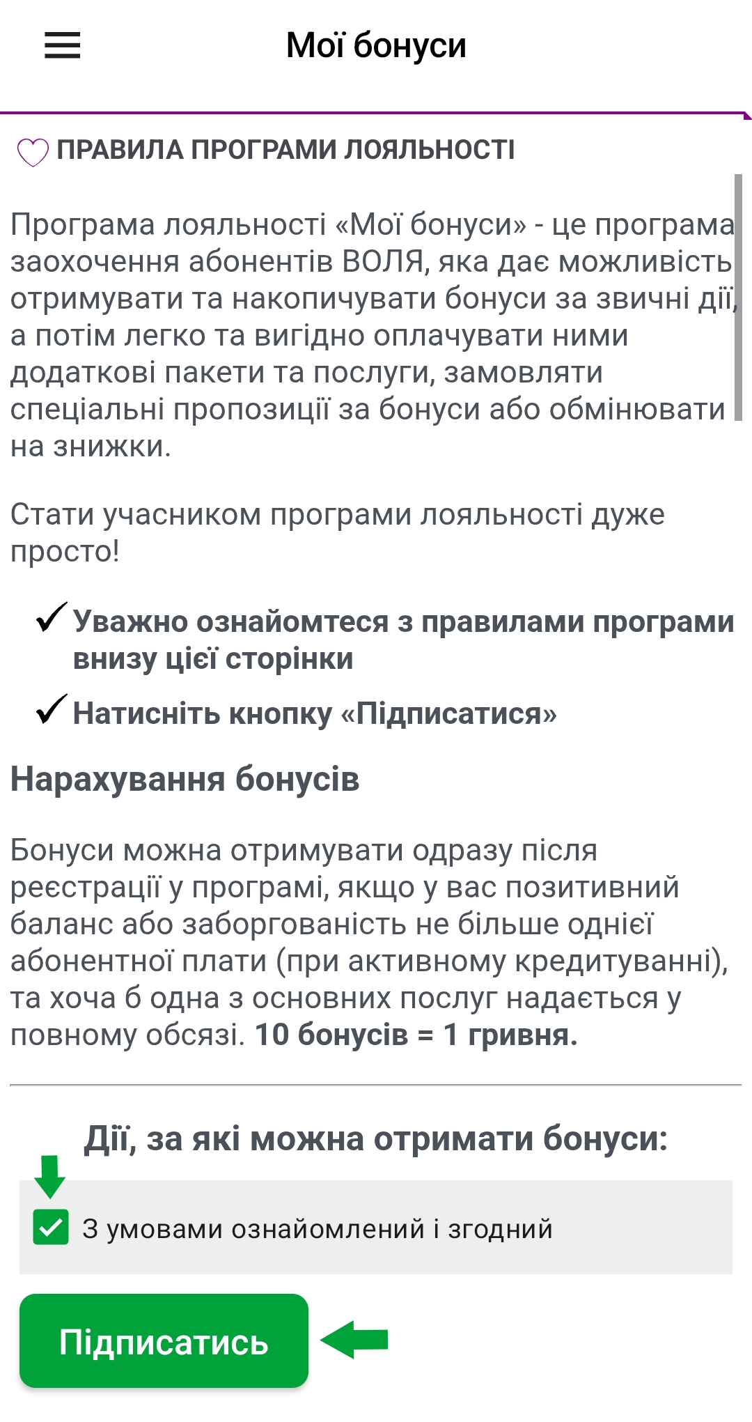 Щоб стати учасником Програми лояльності «Мої бонуси», необхідно підписатися на Програму у мобільному застосунку «My Volia» в розділі «Мої бонуси».